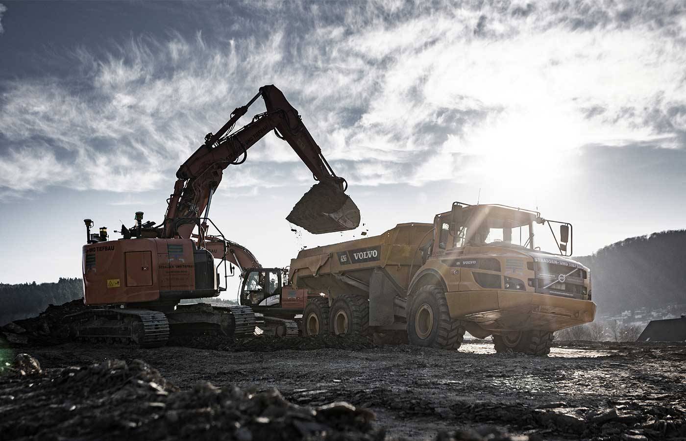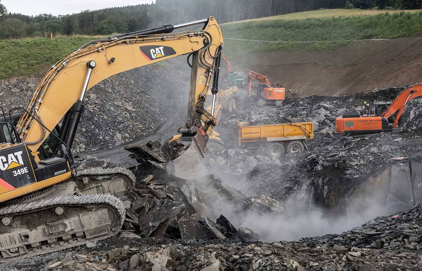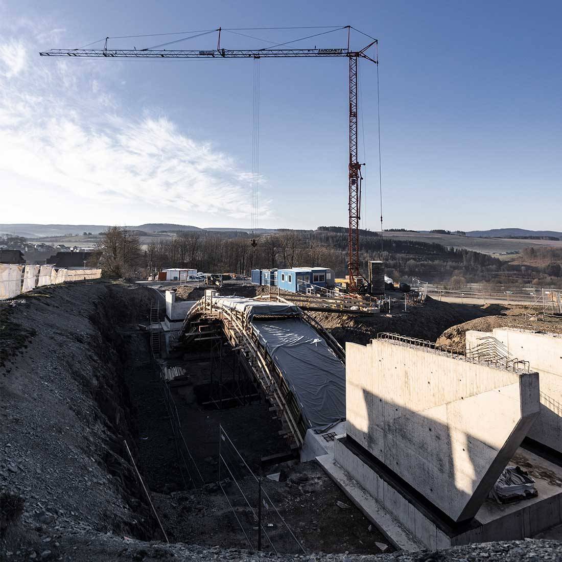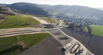 Besonders aufwendig waren die umfangreichen Boden- und Sprengarbeiten im kompakten Schiefer. So wurden insgesamt ca. 270.000 m³ Erdarbeiten durchgeführt. Eine ausgeklügelte Baustellenlogistik führte dazu, dass wir zeitgleich an mehreren Stellen laden und einbauen konnten. Dadurch haben wir eine optimale Auslastung der Lade- und Einbaugeräte gewährleistet.