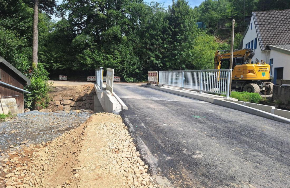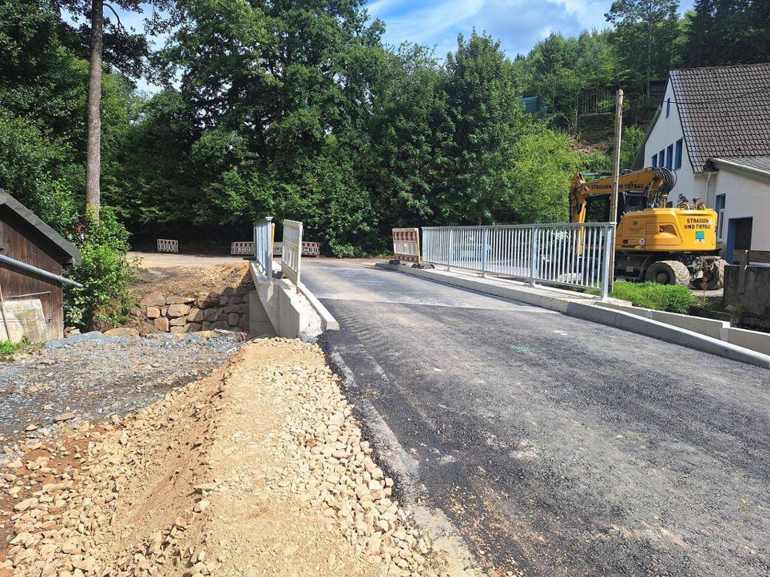 Die im Juli 2021 durch die Jahrhundertflut beschädigte Brücke von Feld und Vornholt nach Halstenbach, Haus Rhade und Berken ist fertiggestellt. Die Gemeindestraße kann nun wieder durchgängig befahren werden „Sitzt, wackelt und hat Luft“, freuten sich Polier Frederik Fleige und die anderen Mitarbeiter der Straßen- und Tiefbau GmbH, dass dies so gut geklappt hatte.